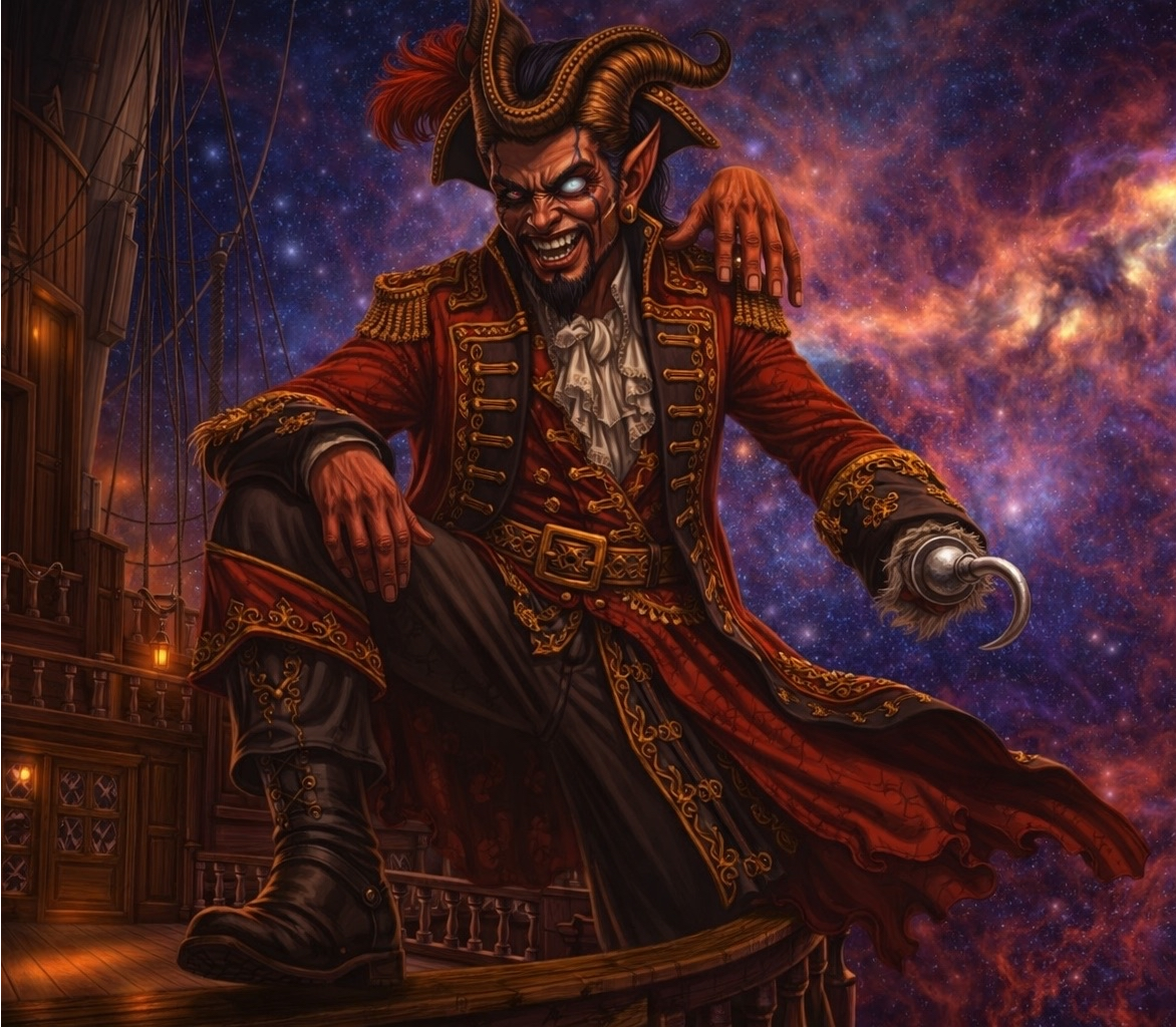 “Captain Grimrod Garglinale is the Tiefling Vampirate master of the Spelljammer Galleon ‘The Last Breath’. He is renowned for being excessively handsome, charming, and the doppelganger of Joffrey Tiefstein”